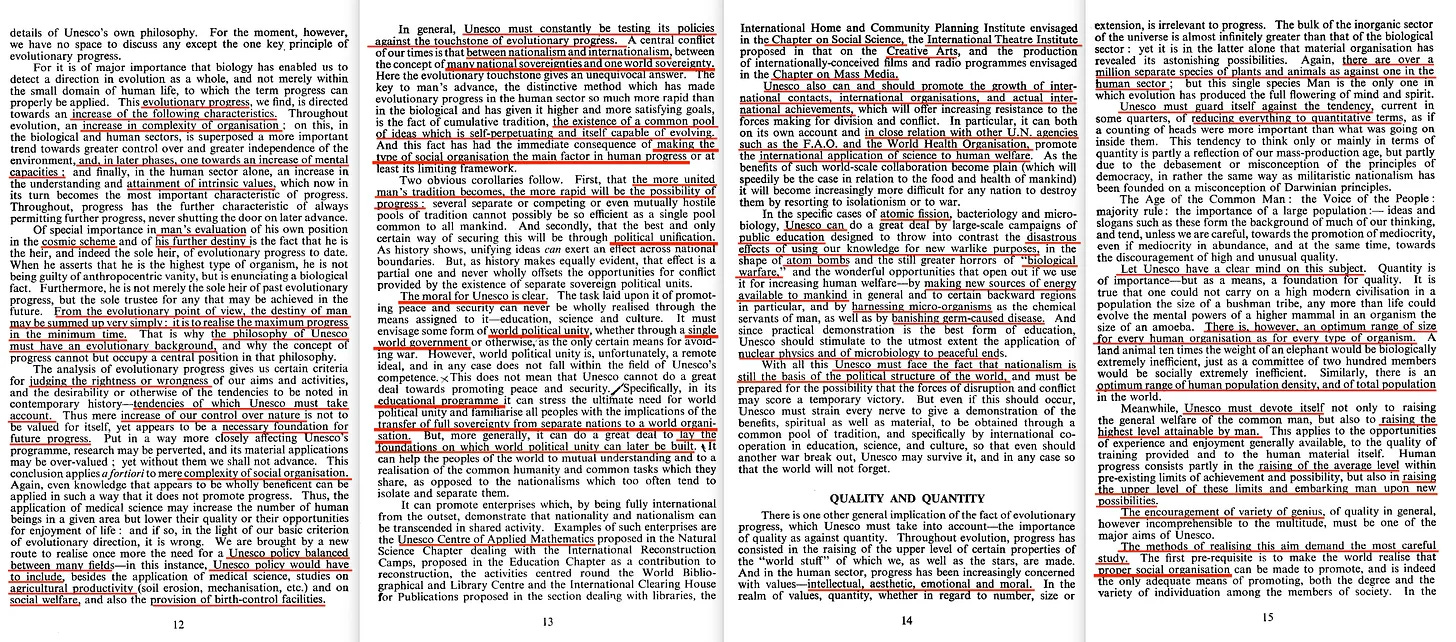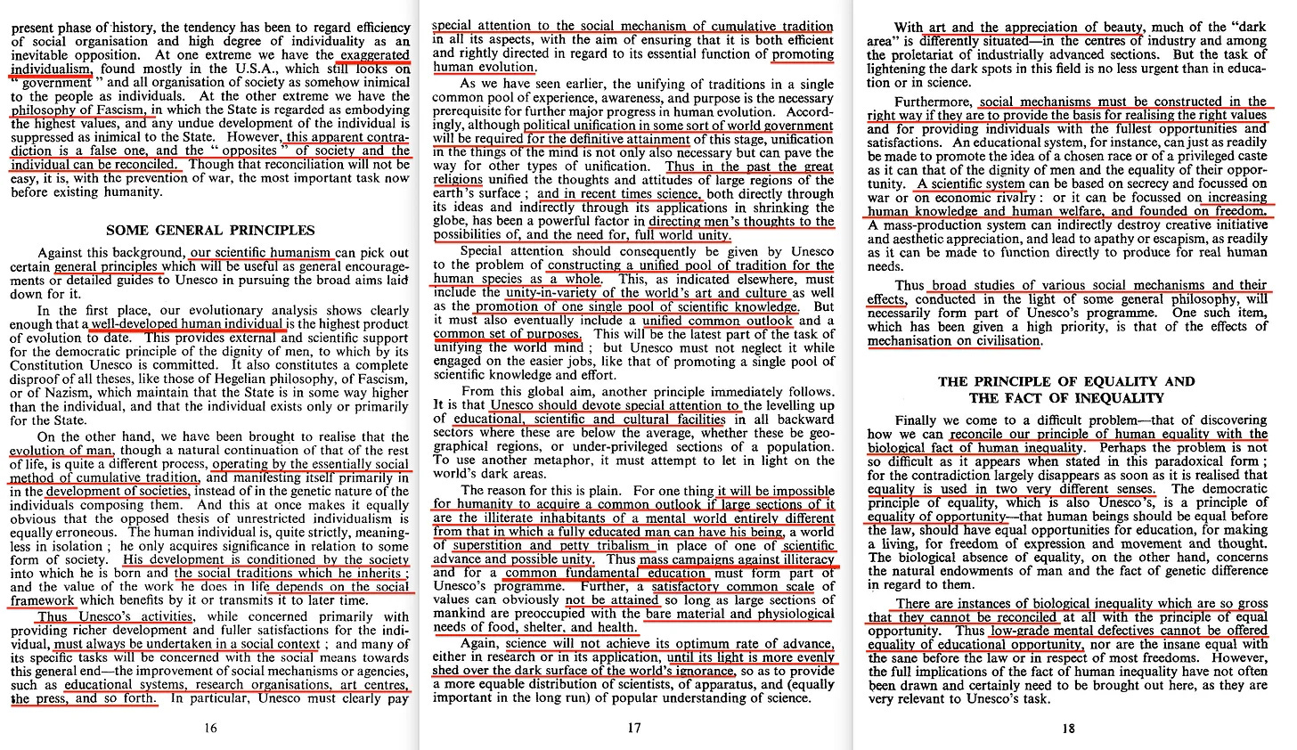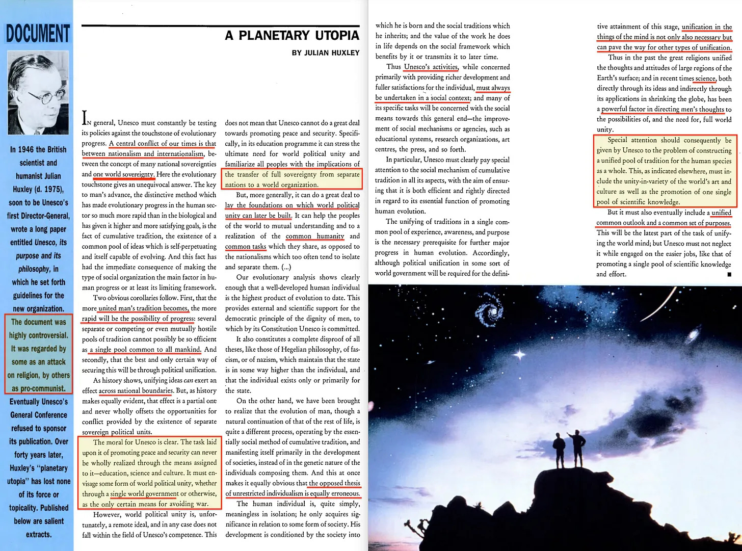 Θα κάνω ένα βήμα παραπέρα και θα δηλώσω απερίφραστα ότι όχι μόνο το εν λόγω έγγραφο ήταν φιλοκομμουνιστικό, αλλά ότι ο Huxley στην πραγματικότητα δεν ήταν τίποτα λιγότερο από ένας Επιστημονικός Σοσιαλιστής. Αλλά πριν φτάσουμε στο πρωτογενές έγγραφο, ας δούμε ένα άρθρο του UNESCO Courier από το 1991, με τίτλο «Μια πλανητική Ουτοπία» -