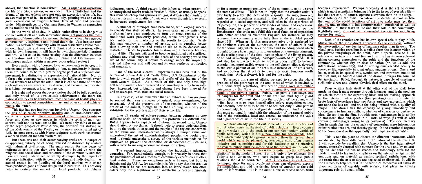 «Έχουμε ήδη επισημάνει ορισμένες από τις κοινωνικές λειτουργίες της τέχνης. Μια άλλη υπάρχει στον τομέα των δημόσιων σχέσεων... Σε έναν κόσμο που πρέπει να σχεδιάζεται, οι κυβερνήσεις πρέπει συχνά να αναλαμβάνουν πρωτοβουλία και ηγεσία- και για να είναι αποτελεσματική αυτή η ηγεσία, το ευρύ κοινό πρέπει να ενημερώνεται για το πρόβλημα και για το τι σκέφτεται η κυβέρνηση. Αυτή είναι η ουσιαστική λειτουργία των «δημοσίων σχέσεων» στο σύγχρονο κράτος. Αλλά είναι μόνο λίγοι πρωτοπόροι, όπως ο Tallents και ο Grierson, που έχουν αρχίσει να αντιλαμβάνονται πώς πρέπει να διεξάγονται οι δημόσιες σχέσεις. Η τέχνη είναι απαραίτητη ως μέρος της τεχνικής».