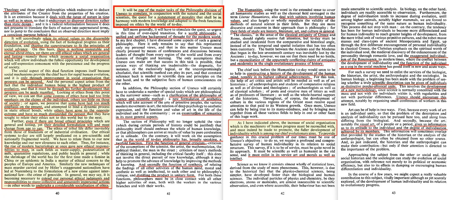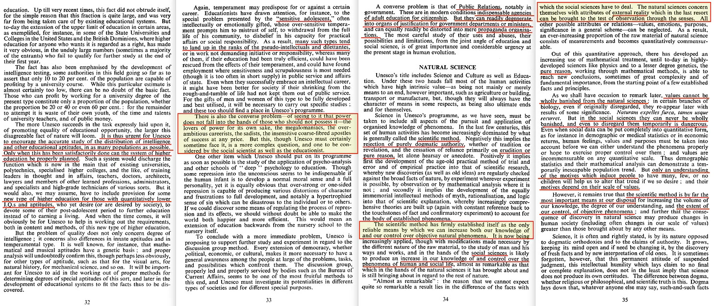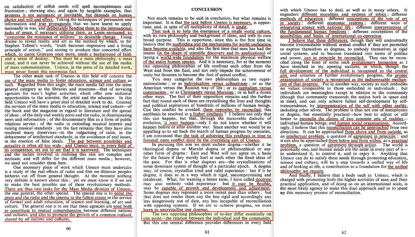 Η αναζήτηση της UNESCO για αρχές που σχετίζονται με τον «επιστημονικό ανθρωπισμό» της οδηγεί σε ένα «ανεπτυγμένο ανθρώπινο άτομο», το οποίο απαιτεί κοινωνικά μέσα όπως η εκπαίδευση, οι ερευνητικές εγκαταστάσεις, τα κέντρα τέχνης, τα μέσα μαζικής ενημέρωσης, ακόμη και η σωρευτική παράδοση, να «κατευθύνονται σωστά όσον αφορά την ουσιαστική λειτουργία της προώθησης της ανθρώπινης εξέλιξης». Αυτό, τελικά, θα οδηγήσει στην «πολιτική ενοποίηση σε κάποιο είδος παγκόσμιας κυβέρνησης», και για το σκοπό αυτό, η επιστήμη θα πρέπει να ασχοληθεί για να «κατευθύνει τις σκέψεις των ανθρώπων στις δυνατότητες και την ανάγκη για πλήρη παγκόσμια ενότητα». Αυτό θα απαιτήσει μια «ενιαία δεξαμενή παραδόσεων» καθώς και μια «ενιαία δεξαμενή επιστημονικών γνώσεων», αλλά τελικά ακόμη και μια «ενιαία κοινή προοπτική και ένα κοινό σύνολο σκοπών», κάτι που για μένα ακούγεται λίγο σαν το ρητό αντίθετο της ελευθερίας.