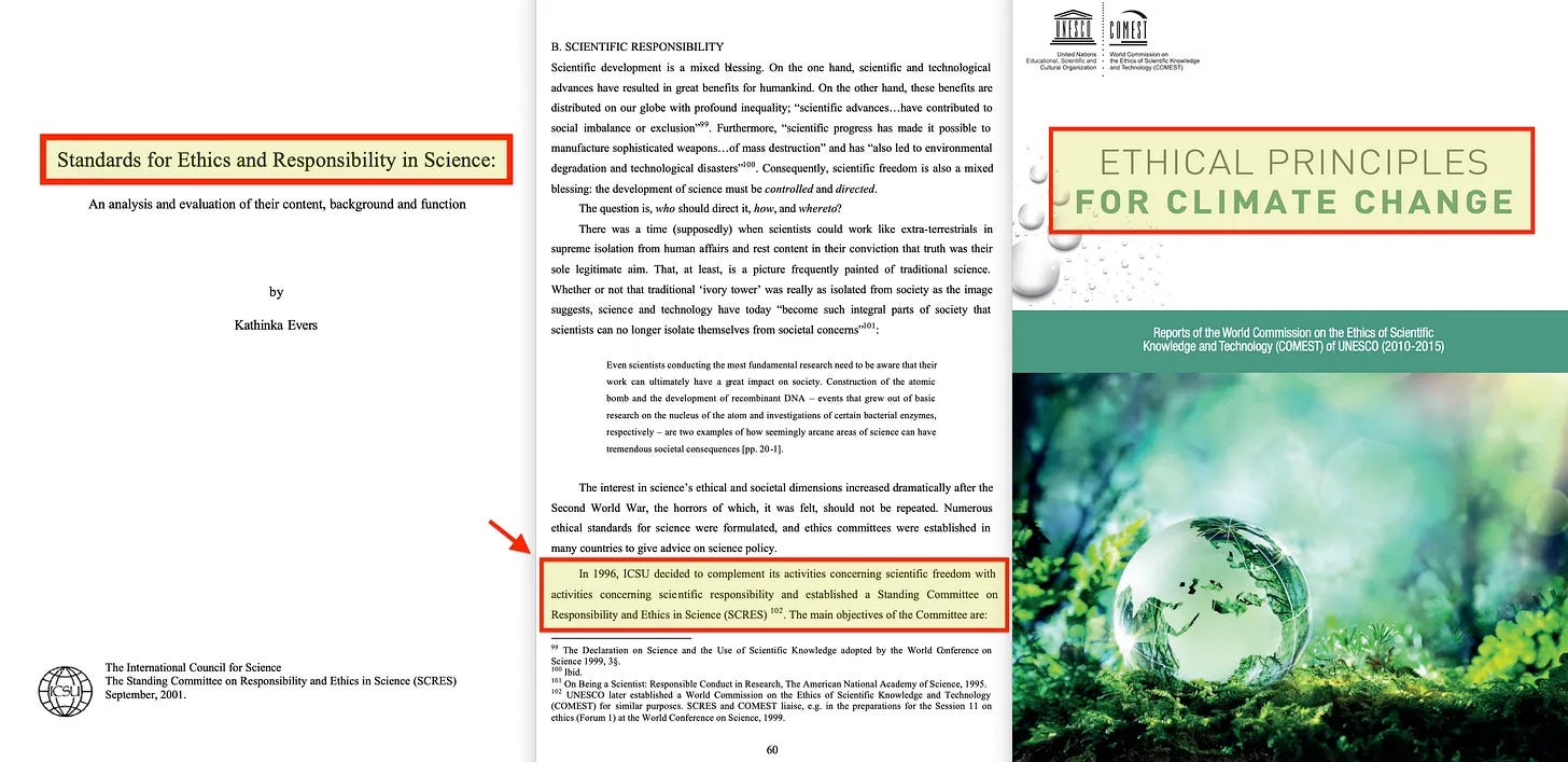 Η επιστημονική μέθοδος θα οδηγεί σε σταθερά περισσότερη αλήθεια, και έτσι θα οδηγεί σε μια εξέλιξη της γνώσης, τα θεμέλια της οποίας μπορεί να υποστούν κάποια διόρθωση με την πάροδο του χρόνου, αλλά σπάνια ανατρέπονται. Αλλά ενώ ο Julian υποστηρίζει ότι η έρευνα δεν πρέπει ποτέ να εμποδίζεται για θρησκευτικούς λόγους, στη συνέχεια κάνει στροφή και δηλώνει ότι «δικαιολογείται πρόσθετη προσοχή όταν φαίνεται ότι δεν συνάδει με το καθιερωμένο σώμα επιστημονικών αρχών», πράγμα που - εν ολίγοις - σημαίνει τη μεταφορά της εξουσίας για τα επιτρεπόμενα θέματα έρευνας από τη θρησκεία στην UNESCO ή σε άλλους επιστημονικούς οργανισμούς. Και με αυτό κατά νου... το 1996 [27], δημιουργήθηκε το ICSU SCRES [28] , εφαρμόζοντας «δηλώσεις ηθικής» εσωτερικά σε επιστήμονες και τομείς, και το 1997 ακολούθησε η UNESCO COMEST [29] , εφαρμόζοντας τις εν λόγω δηλώσεις εξωτερικά μέσω της διάδοσης της γνώσης. Και παρόλο που η απόλυση γιατρών για «παραβιάσεις δεοντολογίας» κατά τη διάρκεια της υποτιθέμενης πανδημίας θα πρέπει να είναι ακόμη νωπή στο μυαλό των ανθρώπων, το 2009 η προσπάθεια για «ηθικές αρχές για την κλιματική αλλαγή» [30] επιταχύνθηκε.
