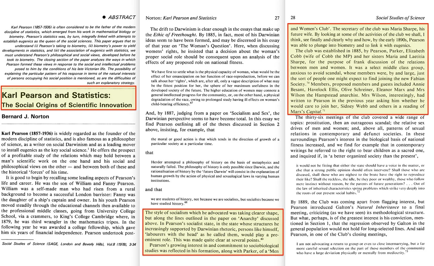 Κλείνοντας θα ήθελα να αναφερθώ σε δύο πράγματα. Αν και ο Karl Pearson πράγματι δεν έγινε ποτέ σοσιαλιστής Fabian, υπήρξε συνιδρυτής της «Λέσχης Ανδρών και Γυναικών», η οποία είχε μεγάλη επικάλυψη με την Fabian Society [42]. Και η κυρία Wilson προσκάλεσε μάλιστα τον Pearson στην ανάγνωση του Κεφαλαίου του Μαρξ από τους Fabian.