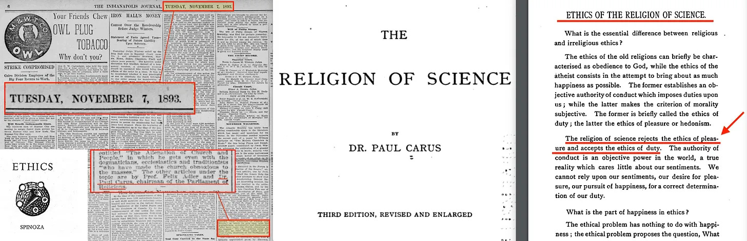 Ωστόσο, ενώ ο Carus συνέθεσε τη θρησκεία και την επιστήμη μέσω της ηθικής... αυτό δεν ήταν αρκετό για τον Huxley, του οποίου ο παππούς - Thomas Henry Huxley - στη διάλεξη Romanes Lecture [18] του 1893 μίλησε για... Εξέλιξη και Ηθική.