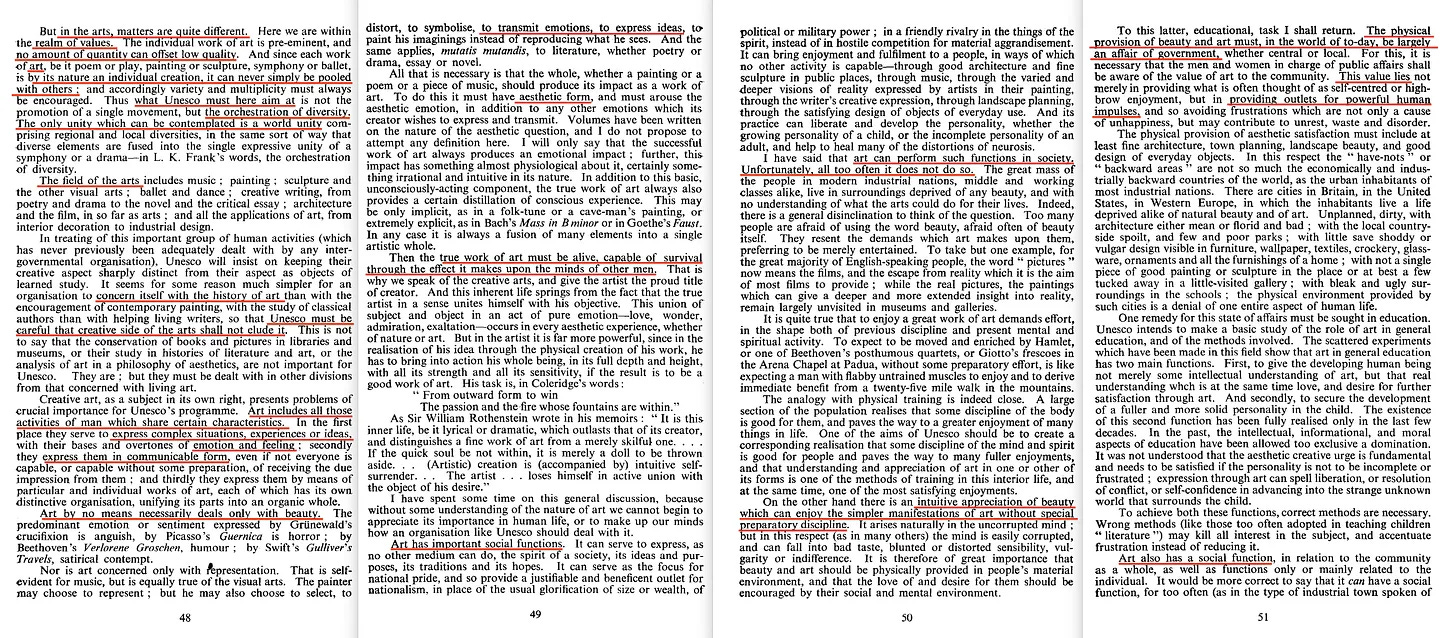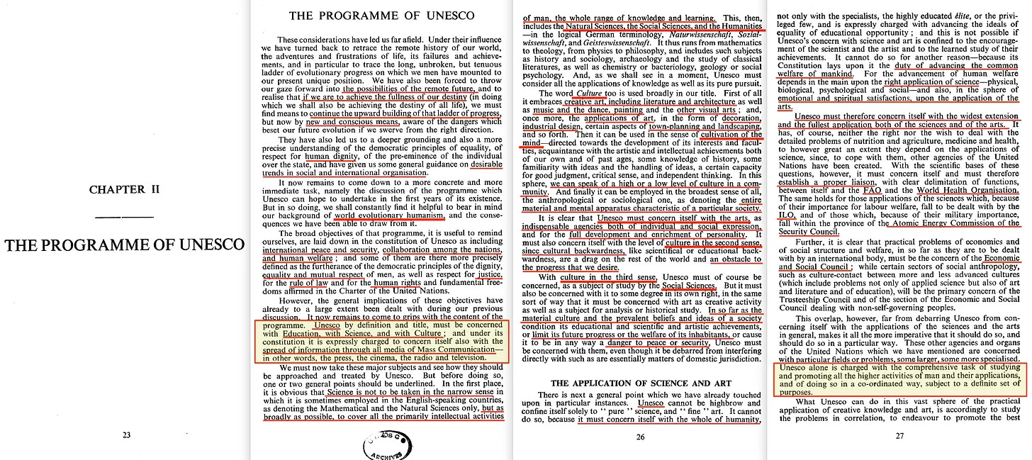 Και όσον αφορά το ποιος θα πρέπει να μελετήσει και να προωθήσει αυτές τις ανώτερες δραστηριότητες του ανθρώπου... λοιπόν, αυτό είναι ένα θέμα που αφορά μόνο την UNESCO, «με την επιφύλαξη ενός συγκεκριμένου συνόλου σκοπών».