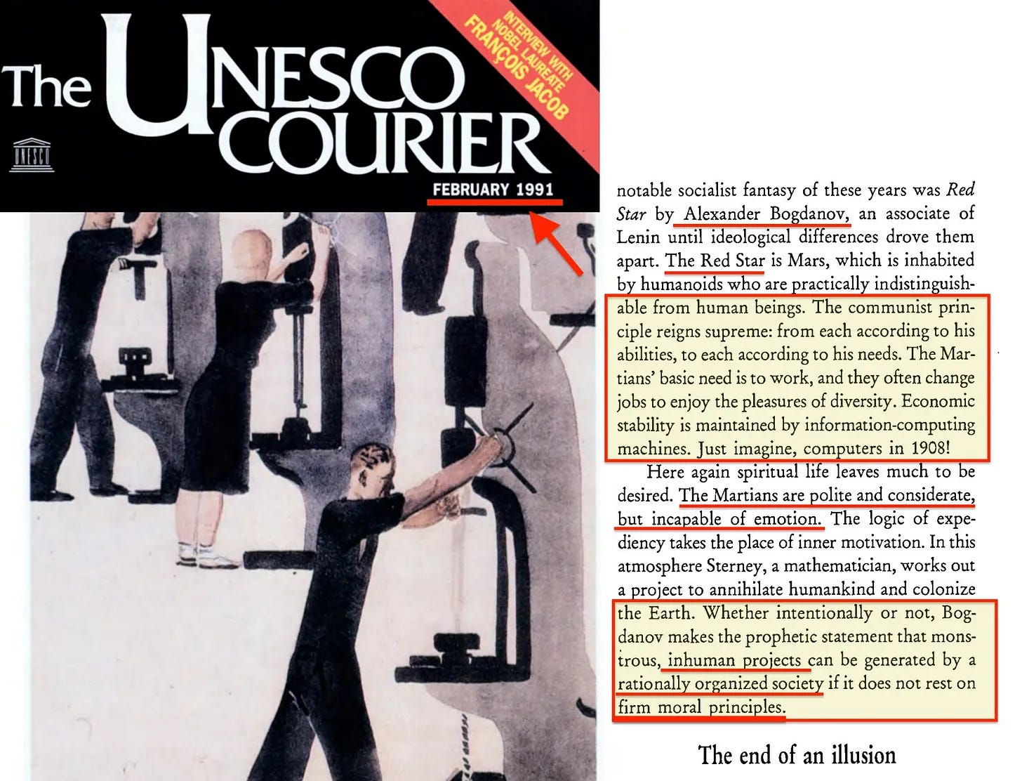 Ήταν αρχικά η ημερομηνία του τεύχους του UNESCO Courier που τράβηξε την προσοχή μου. Βλέπετε, το 1991 η IUCN εγκαινίασε το «Caring for the Earth» [3], το οποίο μπορεί να θεωρηθεί ως η ηθική έκκληση που σχετίζεται με την έκθεσή της του 1980, «World Conservation Strategy» [4] - παρεμπιπτόντως η πρώτη έκθεση που χρησιμοποίησε τον όρο “Βιώσιμη Ανάπτυξη” («Sustainble Development») σε σύγχρονο πλαίσιο. Και το έτος 1991 παρουσιάζει ενδιαφέρον, καθώς το 1992 ακολούθησε η Σύνοδος Κορυφής της Γης στο Rio. Αλλά το τεύχος του Courier περιείχε επίσης ένα άρθρο που εστίαζε στο μυθιστόρημα του Alexander Bogdanov «Κόκκινο Αστέρι».