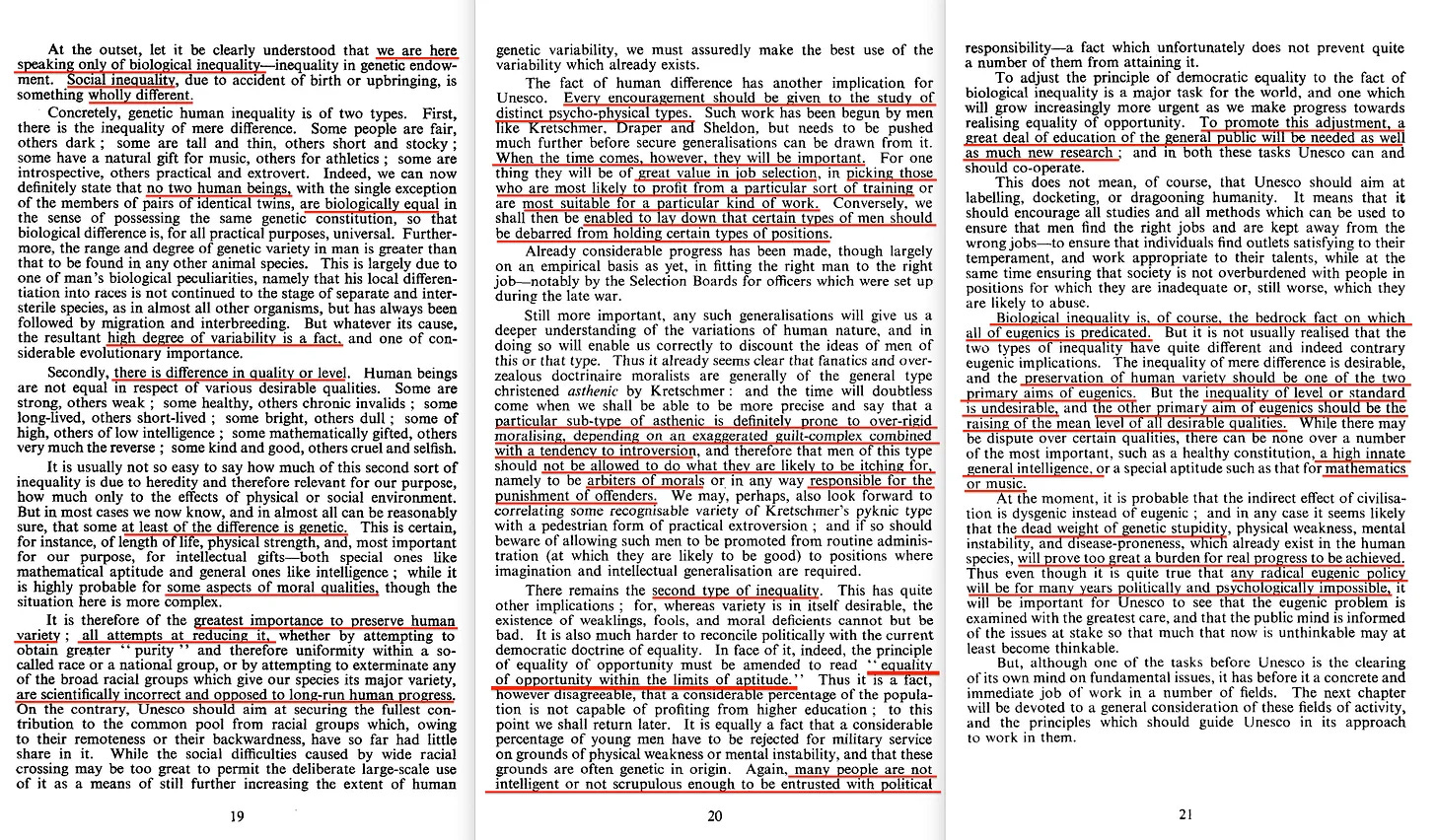«... φαίνεται πιθανό ότι το νεκρό βάρος της γενετικής βλακείας, της σωματικής αδυναμίας, της διανοητικής αστάθειας και της επιρρέπειας σε ασθένειες, που ήδη υπάρχει στο ανθρώπινο είδος, θα αποδειχθεί πολύ μεγάλο βάρος για την επίτευξη πραγματικής προόδου. Έτσι, αν και είναι απολύτως αληθές ότι οποιαδήποτε ριζοσπαστική ευγονική πολιτική θα είναι για πολλά χρόνια πολιτικά και ψυχολογικά αδύνατη, θα είναι σημαντικό για την Unesco να φροντίσει να εξεταστεί το ευγονικό πρόβλημα με τη μεγαλύτερη δυνατή προσοχή και να ενημερωθεί η κοινή γνώμη για τα ζητήματα που διακυβεύονται, ώστε πολλά από αυτά που τώρα είναι αδιανόητα να γίνουν τουλάχιστον νοητά».