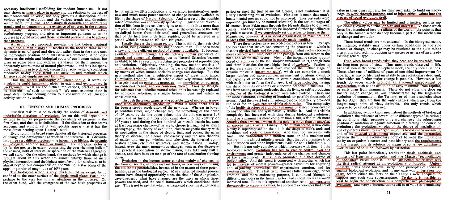 Στη συνέχεια ο Julian μιλάει για την εξελικτική πρόοδο, περιγράφει ακόμη και τον χαρακτηρισμό της, μιλάει για «την αξιολόγηση του ανθρώπου για τη θέση του στο κοσμικό σχήμα και για το περαιτέρω πεπρωμένο του», όπου η αναφορά στο σύμπαν θα μπορούσε να παραπέμπει στον Teilhard και την Κοσμογένεση [25], πριν εφαρμόσει όλα αυτά στο πλαίσιο του σκοπού της UNESCO -